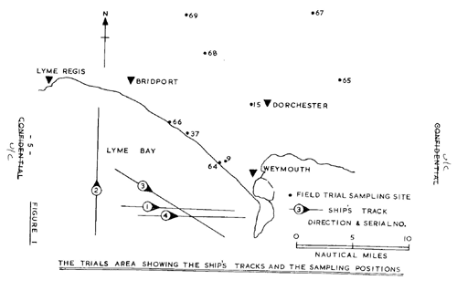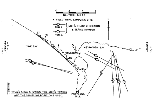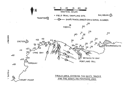 Apart from four preliminary experiments, all Lyme Bay trials that were carried out during trials seasons 1 and 2 (Oct 1963-Apr 1964 and Oct 1964- May 1965), were conducted during the hours of darkness. It was important, for experimental reasons, that the E.coli MRE162 was not subjected to daylight. Operating in the hours of darkness also added to the aura of secrecy which accompanied these Top Secret experiments.