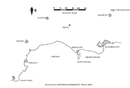 It was quickly realised that the Porton Range (area 7,000 acres) was far too small to be used in any of these proposed experiments. The Director of the MRE Porton Down, Dr D W Henderson, then suggested that spraying the bacteria at sea and detecting the resulting aerosol cloud inland might be a successful operational method, and so a search began for a suitable trials site in the UK.