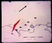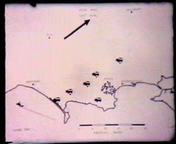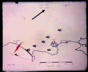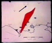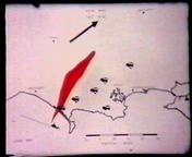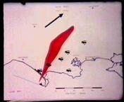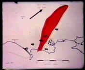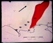 Still frames from an animation of the trials procedure; showing the spray ship sailing a straight line track across Lyme Bay and disseminating bacteria- the resulting massive bacterial aerosol cloud is carried onshore by the prevailing wind- mobile teams of Porton scientists attempt to sample the cloud as it travels inland.